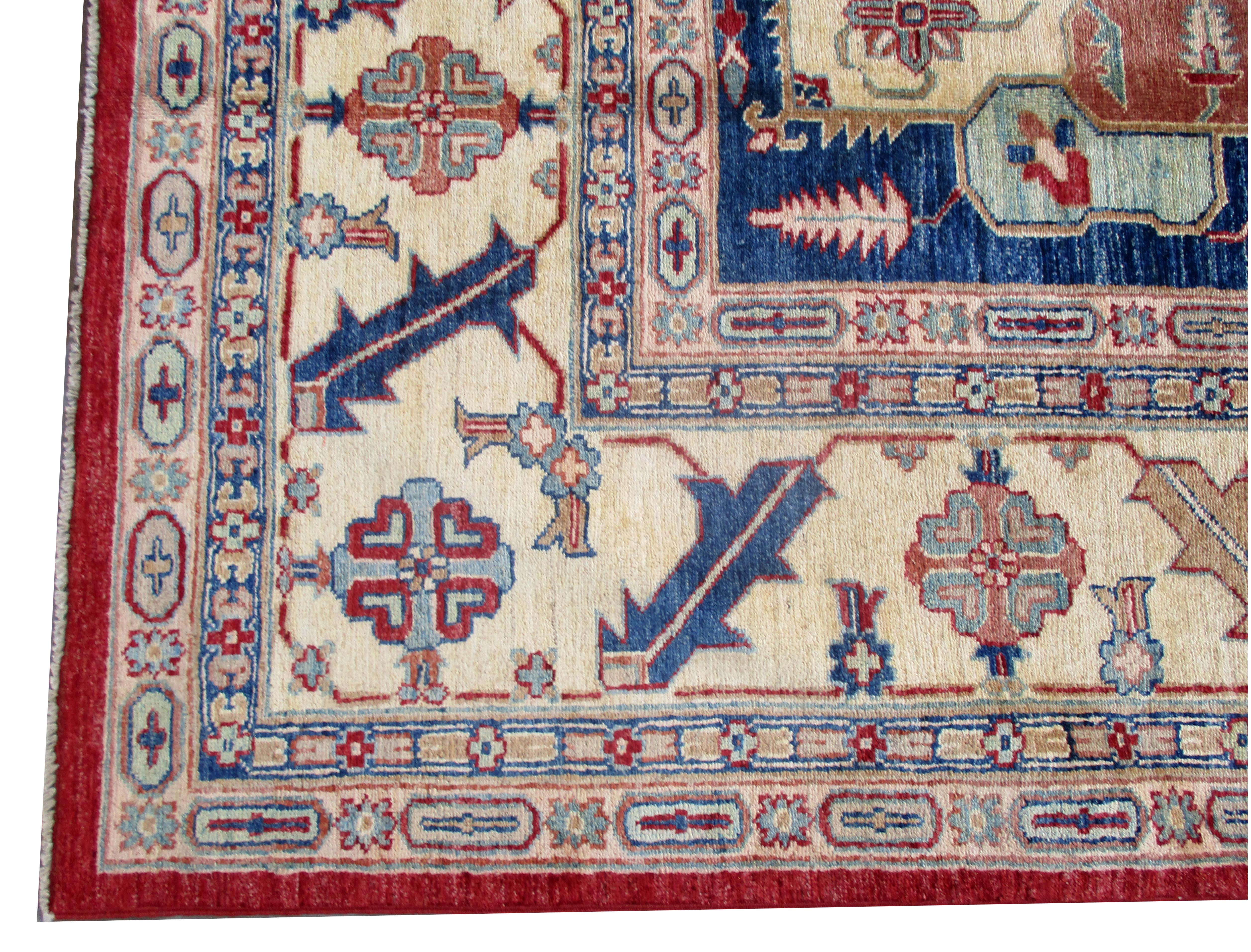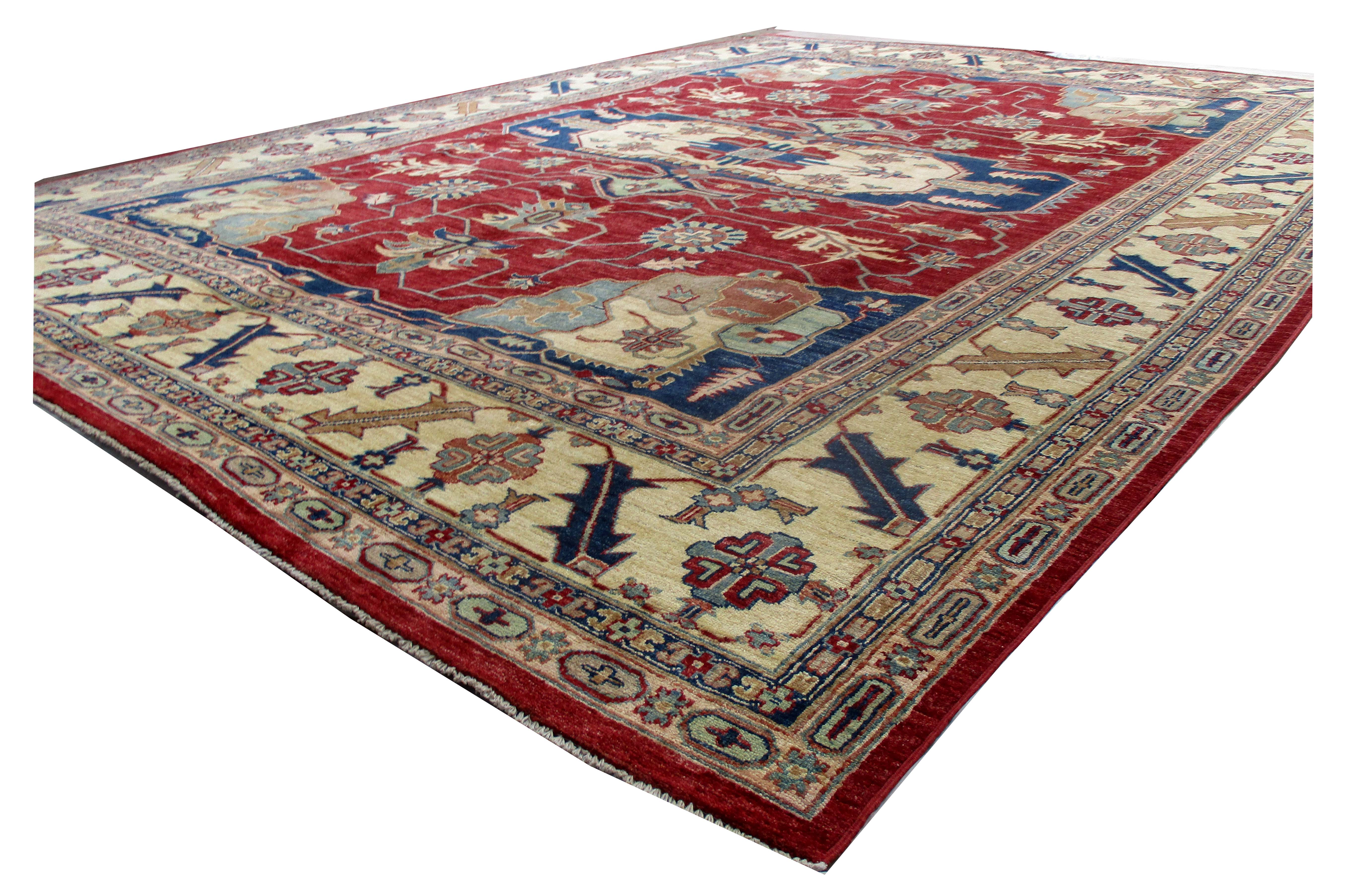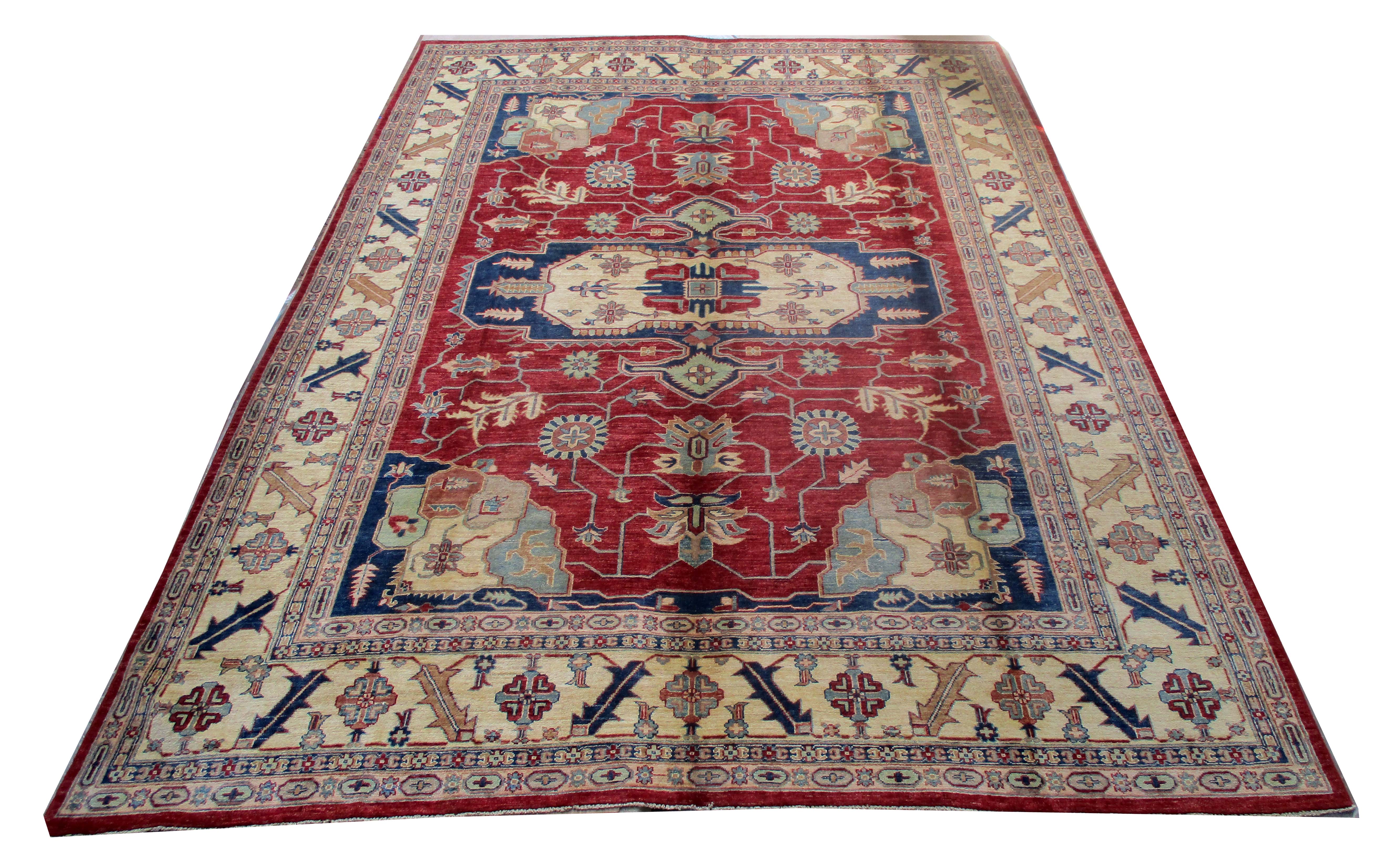These are beautiful reproduction of centuries old Central Asian Caucasian designs by Afghan weavers mainly by Hazara Tribe known as master weavers in Afghanistan. Material is a high-quality natural wool spun by hand using their centuries old traditional skill to create a perfect texture to the carpet. Specific vibrant colors are used to give closest look to the ancient designs, using their secret knowledge passed through family traditions . The weaving skill, knowledge of hand spinning wool and skill to match various vibrant colors have revived some of the master pieces, as close to the rugs produced in past.