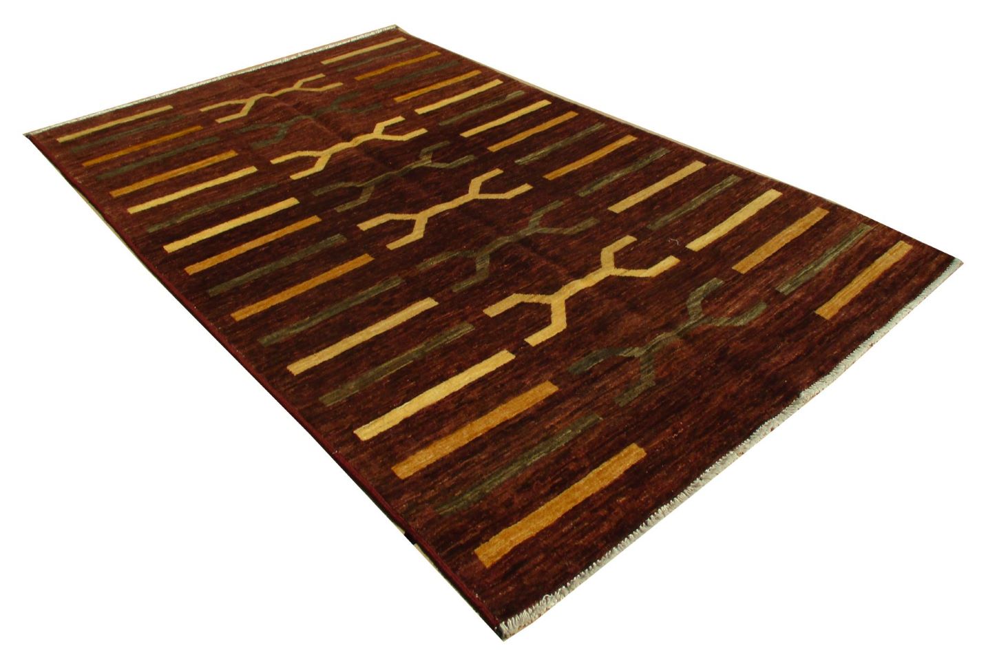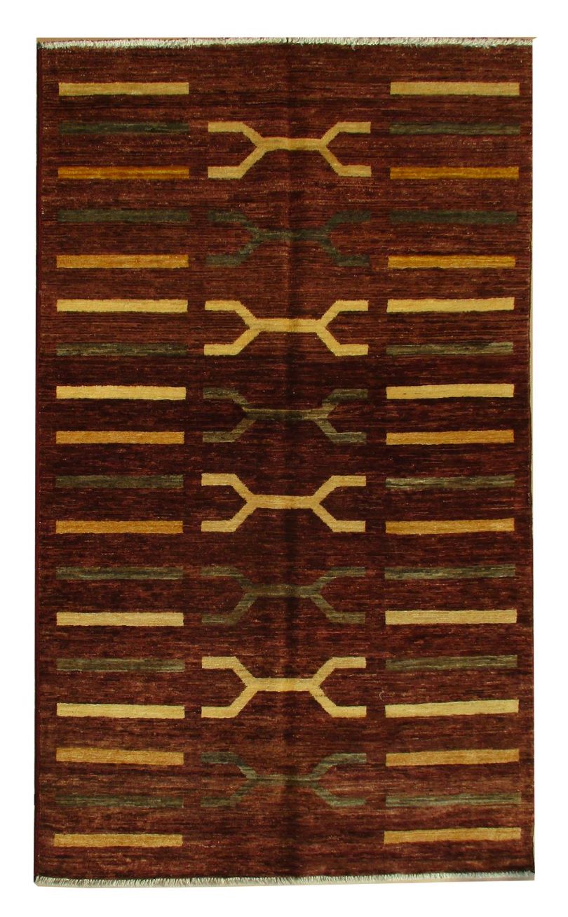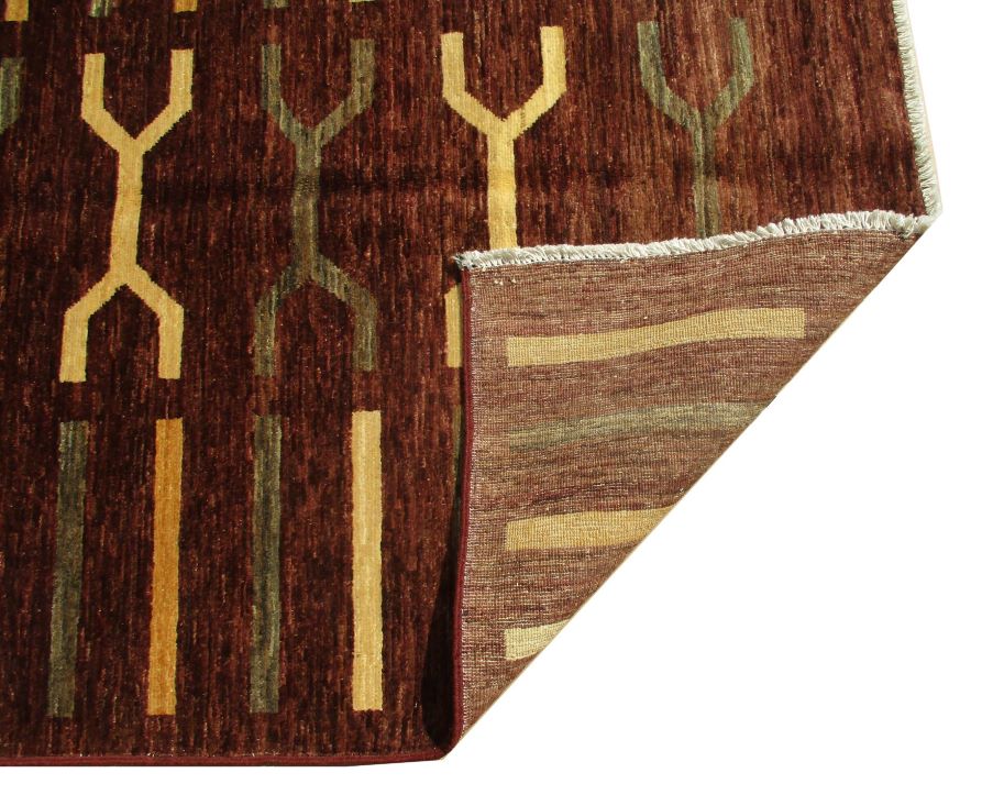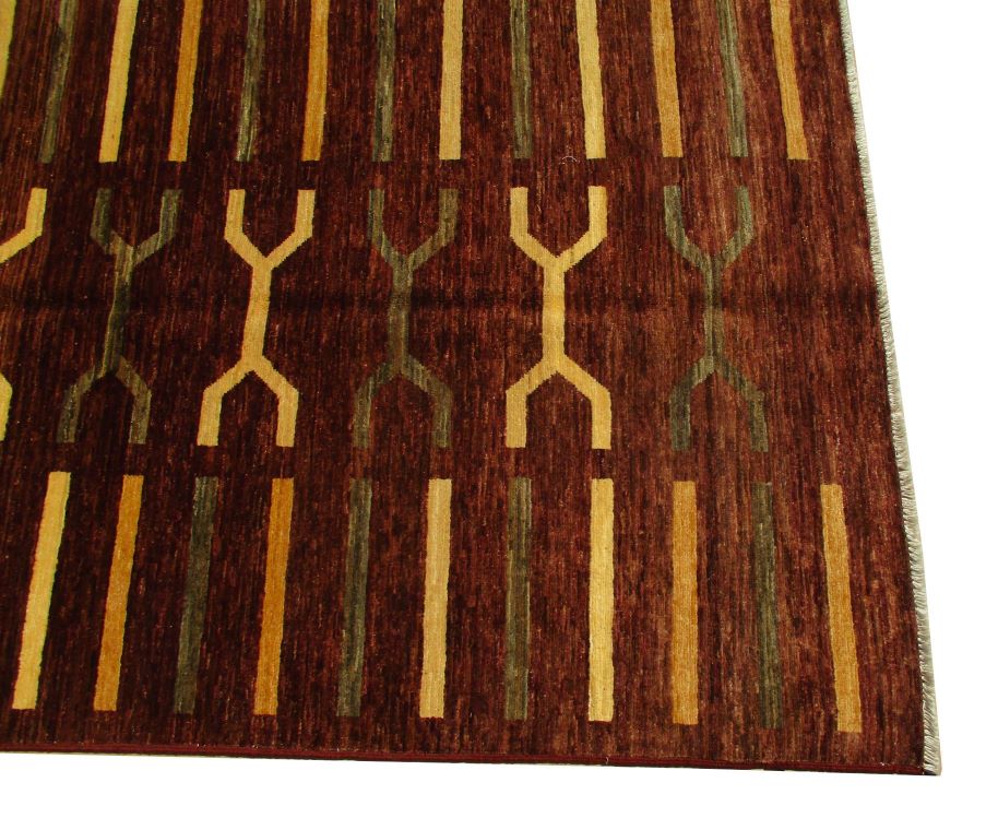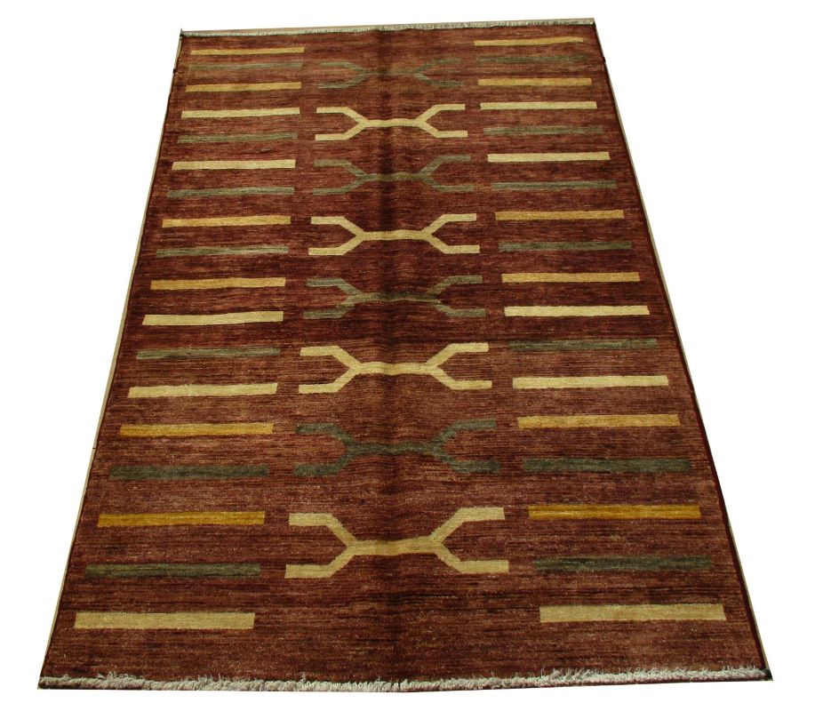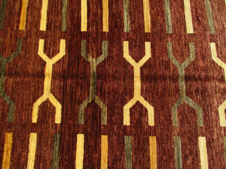 A beautiful reproduction of carefully selected contemporary modern designs by Afghan weavers mainly Turkomans in Afghanistan. Material is a high-quality natural wool spun by hand using their centuries old traditional skill to create a perfect texture. Colors and dyes are often used from organic plants for muted finish, using their secret knowledge from nomadic way of life. Over the time, some contemporaries modern designs provided by the western carpet dealers. The weaving skill of Turkomans, technique of hand spinning wool and colors have created some of the master pieces in modern designs.