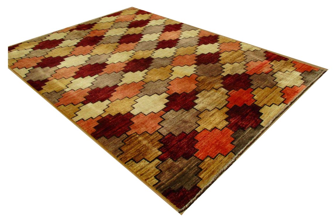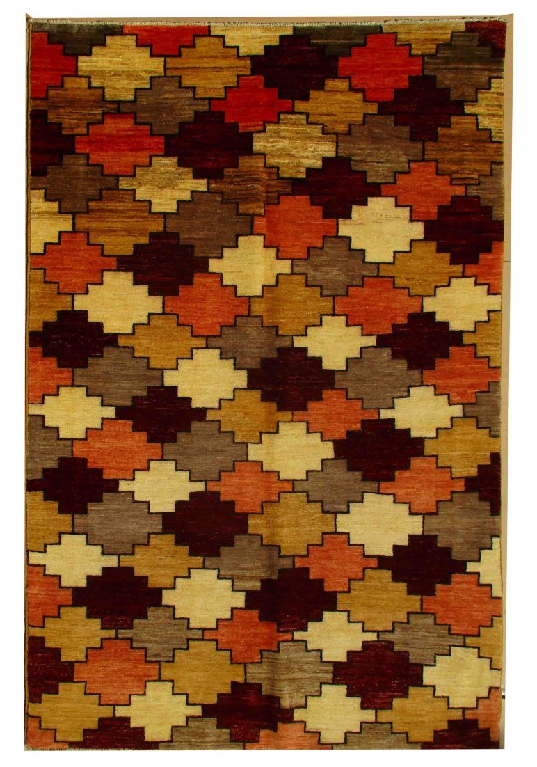 A beautiful reproduction of carefully selected contemporary modern designs by Afghan weavers mainly Turkomans in Afghanistan. Material is a high-quality natural wool spun by hand using their centuries old traditional skill to create a perfect texture. Colors and dyes are often used from organic plants for muted finish, using their secret knowledge from nomadic way of life. Over the time, some contemporaries modern designs provided by the western carpet dealers. The weaving skill of Turkomans, technique of hand spinning wool and colors have created some of the master pieces in modern designs.