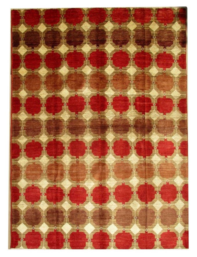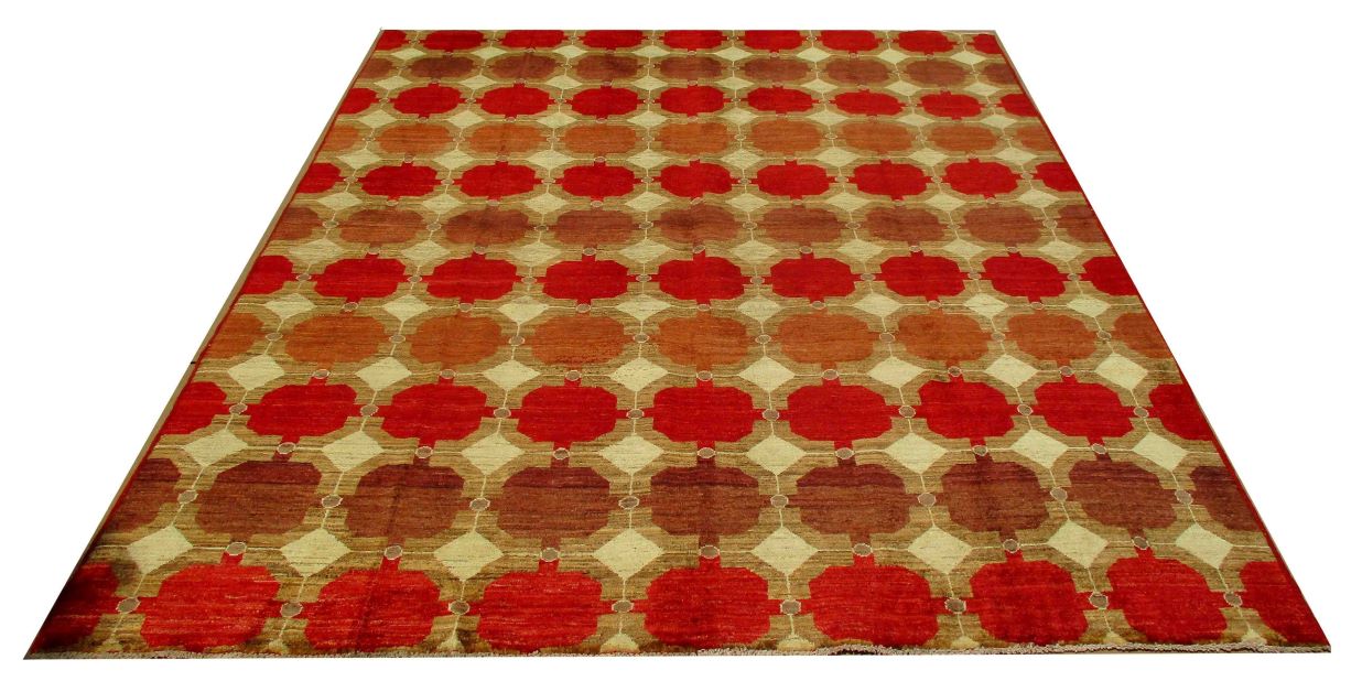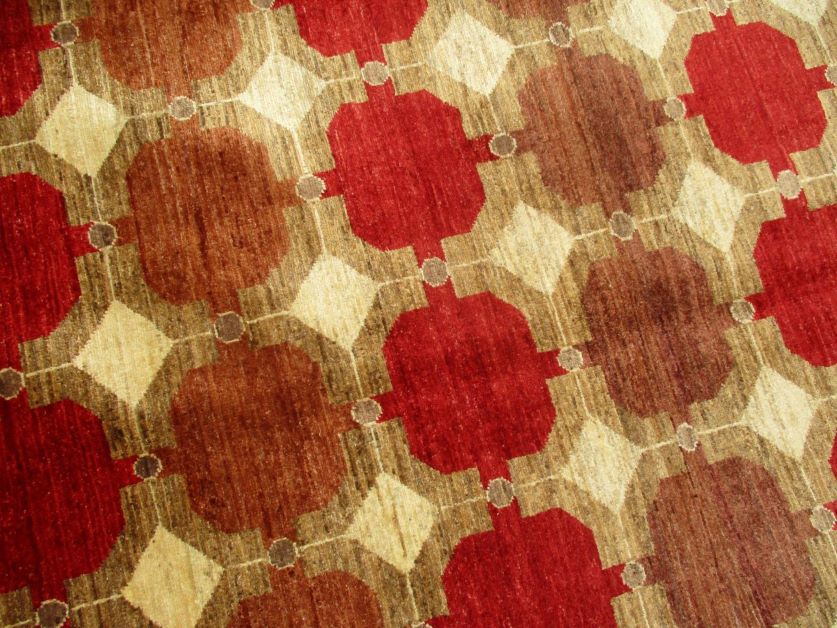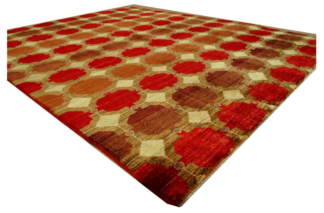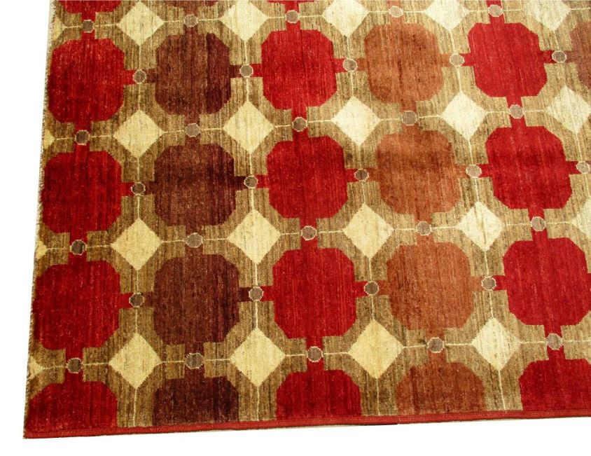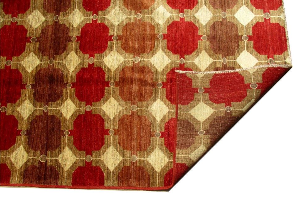 A beautiful reproduction of carefully selected contemporary modern designs by Afghan weavers mainly Turkomans in Afghanistan. Material is a high-quality natural wool spun by hand using their centuries old traditional skill to create a perfect texture. Colors and dyes are often used from organic plants for muted finish, using their secret knowledge from nomadic way of life. Over the time, some contemporaries modern designs provided by the western carpet dealers. The weaving skill of Turkomans, technique of hand spinning wool and colors have created some of the master pieces in modern designs.
