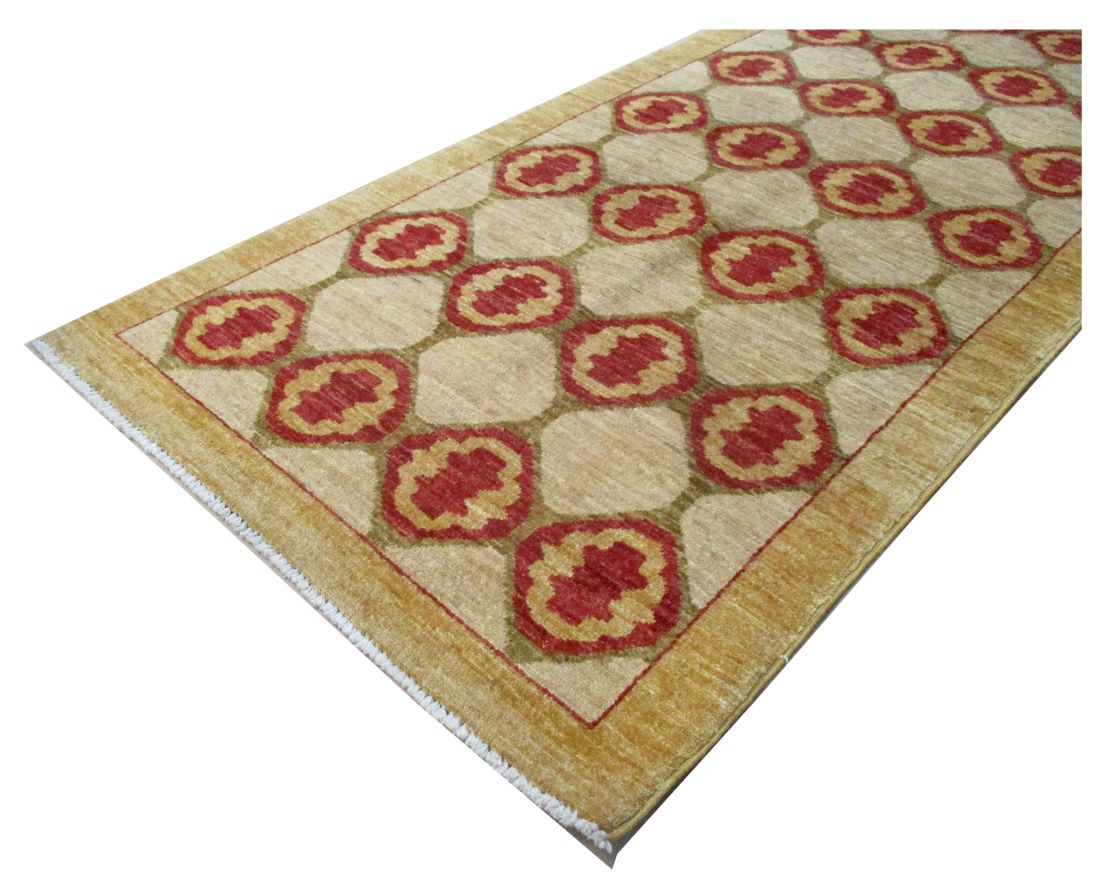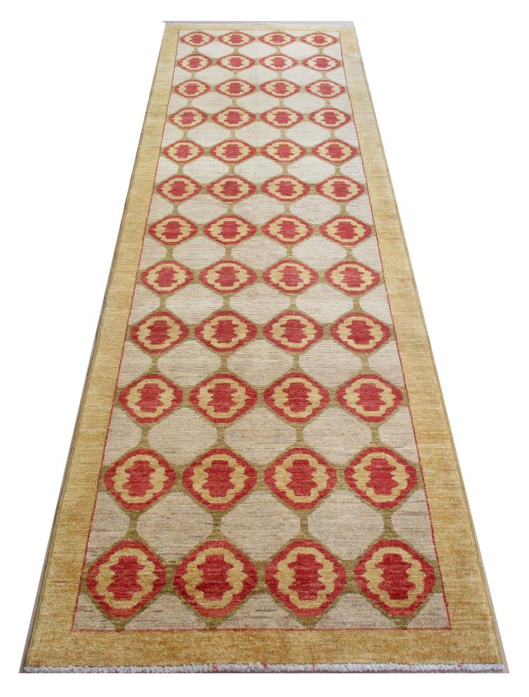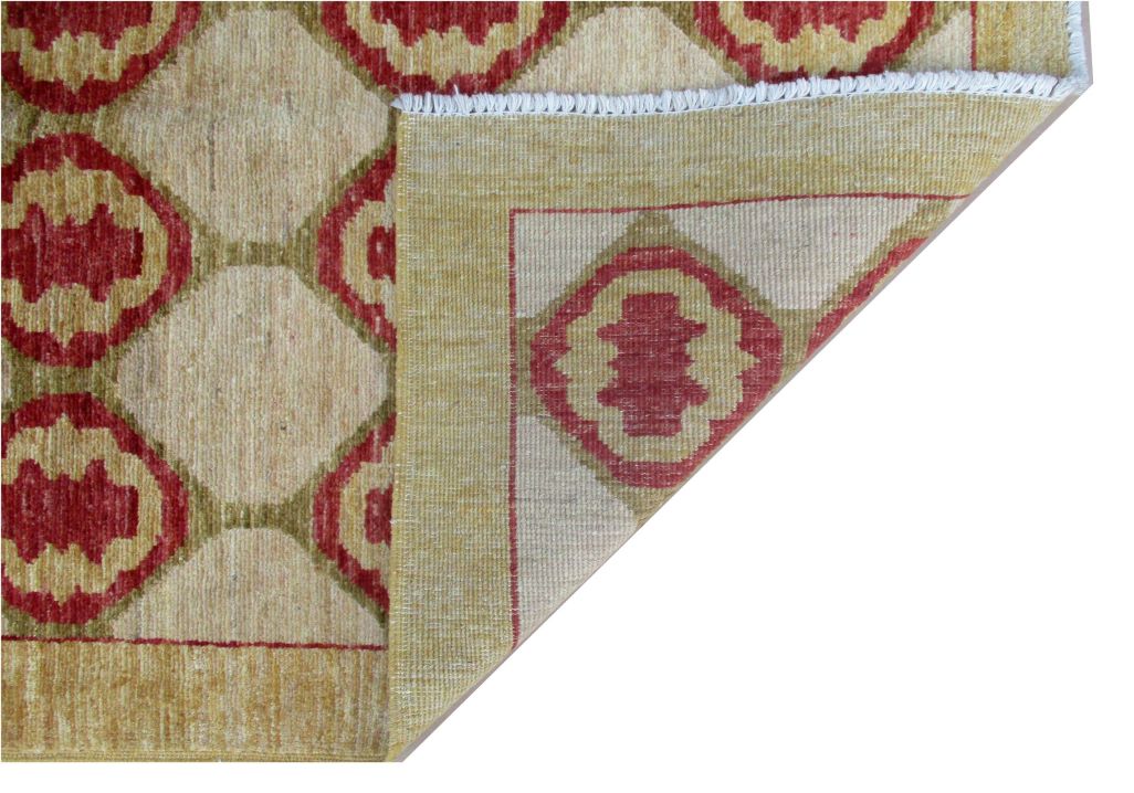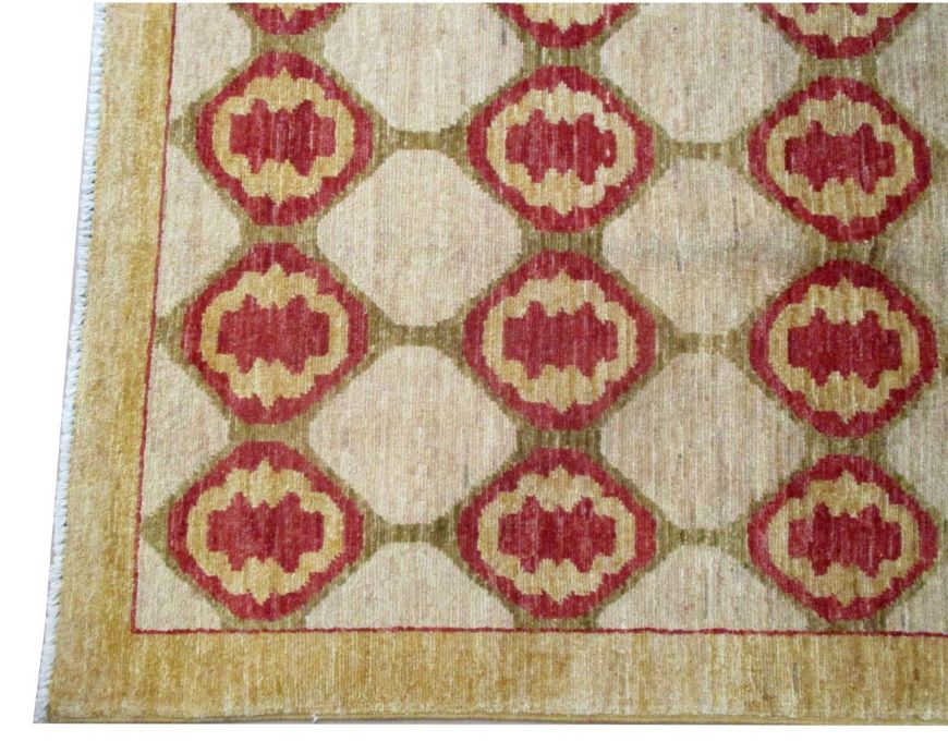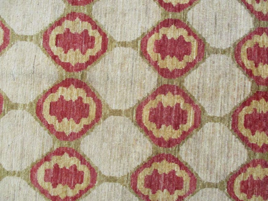 A beautiful reproduction of carefully selected contemporary modern designs by Afghan weavers mainly Turkomans in Afghanistan. Material is a high-quality natural wool spun by hand using their centuries old traditional skill to create a perfect texture. Colors and dyes are often used from organic plants for muted finish, using their secret knowledge from nomadic way of life. Over the time, some contemporaries modern designs provided by the western carpet dealers. The weaving skill of Turkomans, technique of hand spinning wool and colors have created some of the master pieces in modern designs.