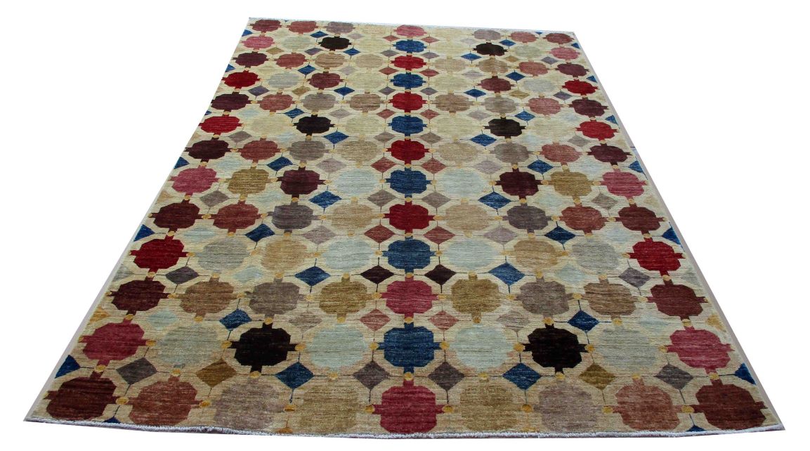 A beautiful reproduction of carefully selected contemporary modern designs by Afghan weavers mainly Turkomans in Afghanistan. Material is a high-quality natural wool spun by hand using their centuries old traditional skill to create a perfect texture. Colors and dyes are often used from organic plants for muted finish, using their secret knowledge from nomadic way of life. Over the time, some contemporaries modern designs provided by the western carpet dealers. The weaving skill of Turkomans, technique of hand spinning wool and colors have created some of the master pieces in modern designs.