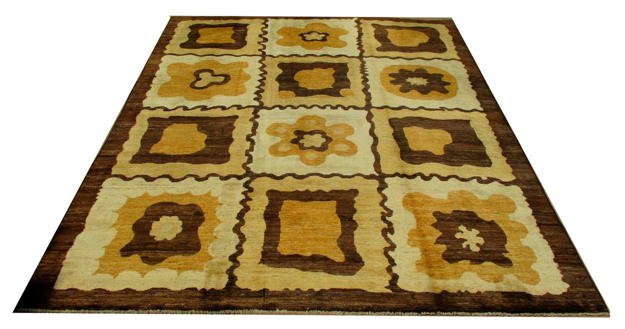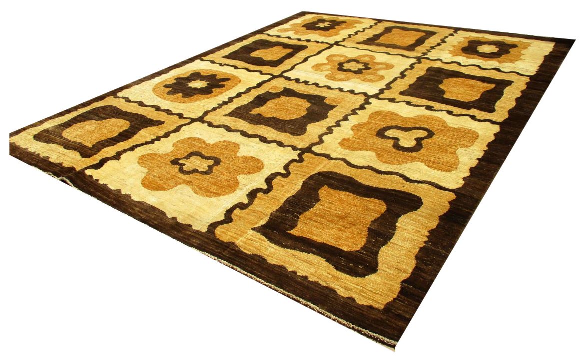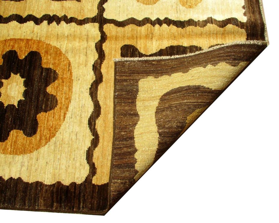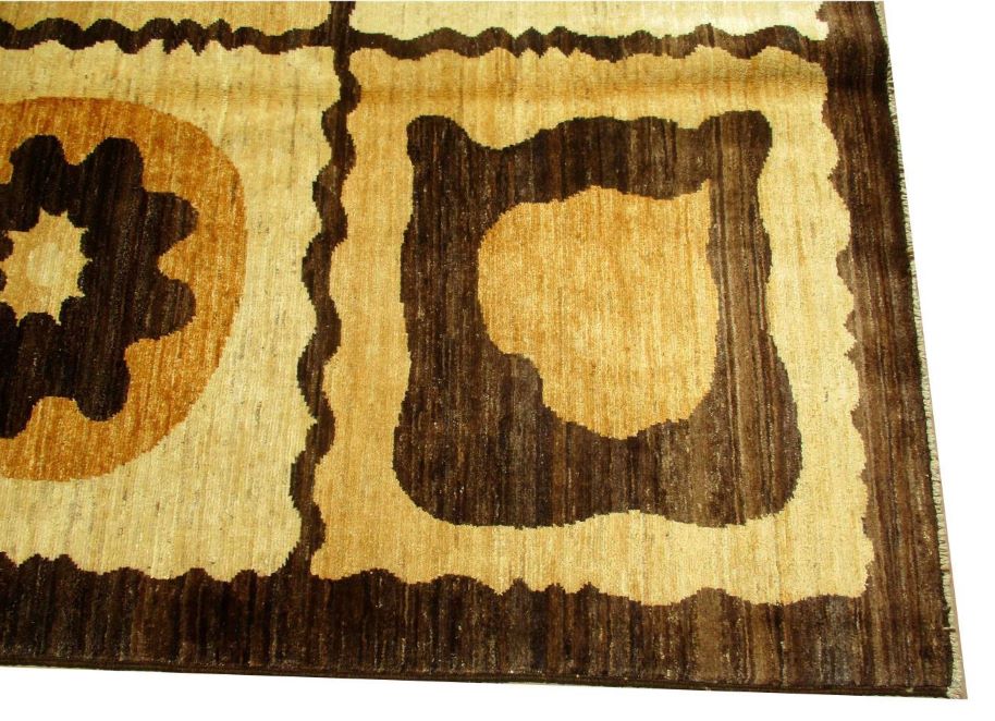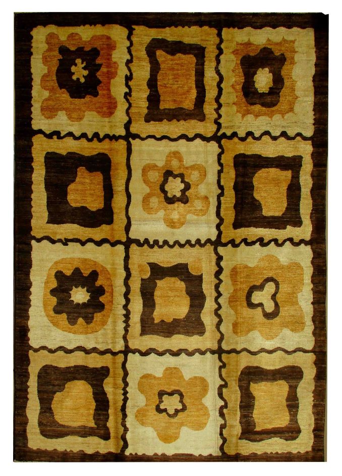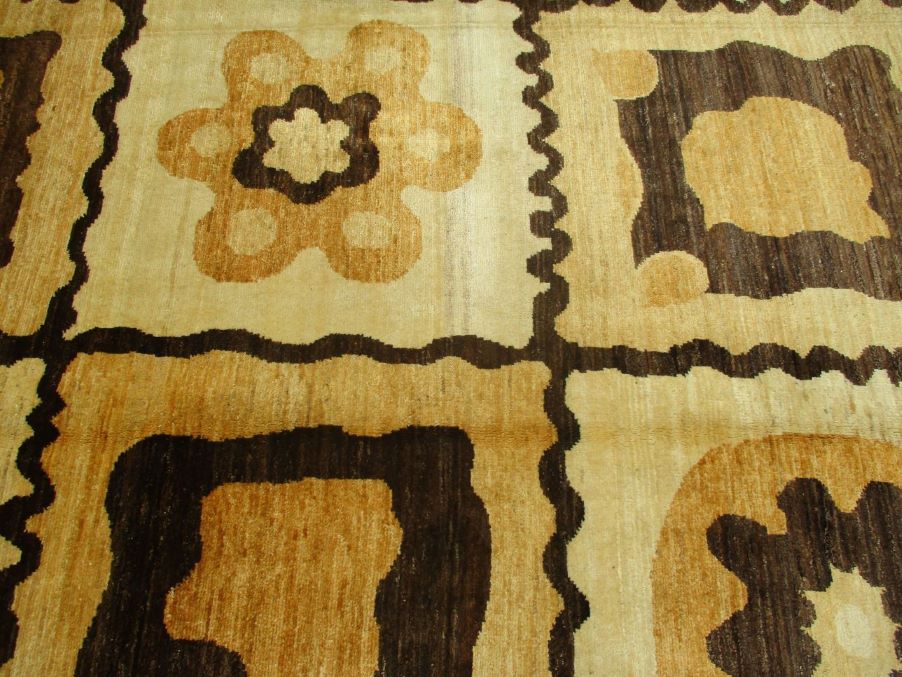 A beautiful reproduction of carefully selected contemporary modern designs by Afghan weavers mainly Turkomans in Afghanistan. Material is a high-quality natural wool spun by hand using their centuries old traditional skill to create a perfect texture. Colors and dyes are often used from organic plants for muted finish, using their secret knowledge from nomadic way of life. Over the time, some contemporaries modern designs provided by the western carpet dealers. The weaving skill of Turkomans, technique of hand spinning wool and colors have created some of the master pieces in modern designs.