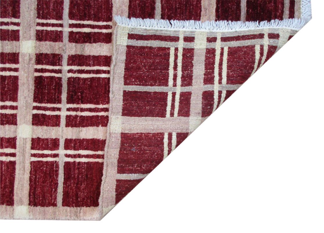 A beautiful reproduction of carefully selected contemporary modern designs by Afghan weavers mainly Turkomans in Afghanistan. Material is a high-quality natural wool spun by hand using their centuries old traditional skill to create a perfect texture. Colors and dyes are often used from organic plants for muted finish, using their secret knowledge from nomadic way of life. Over the time, some contemporaries modern designs provided by the western carpet dealers. The weaving skill of Turkomans, technique of hand spinning wool and colors have created some of the master pieces in modern designs.