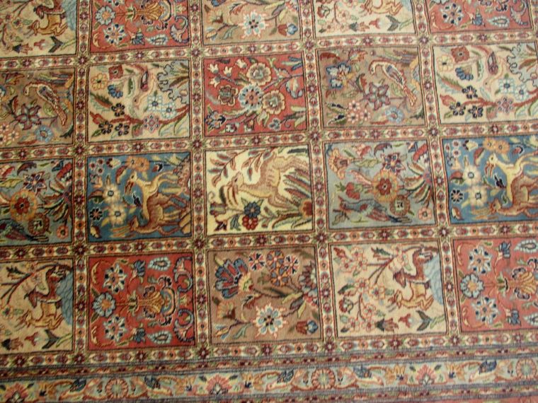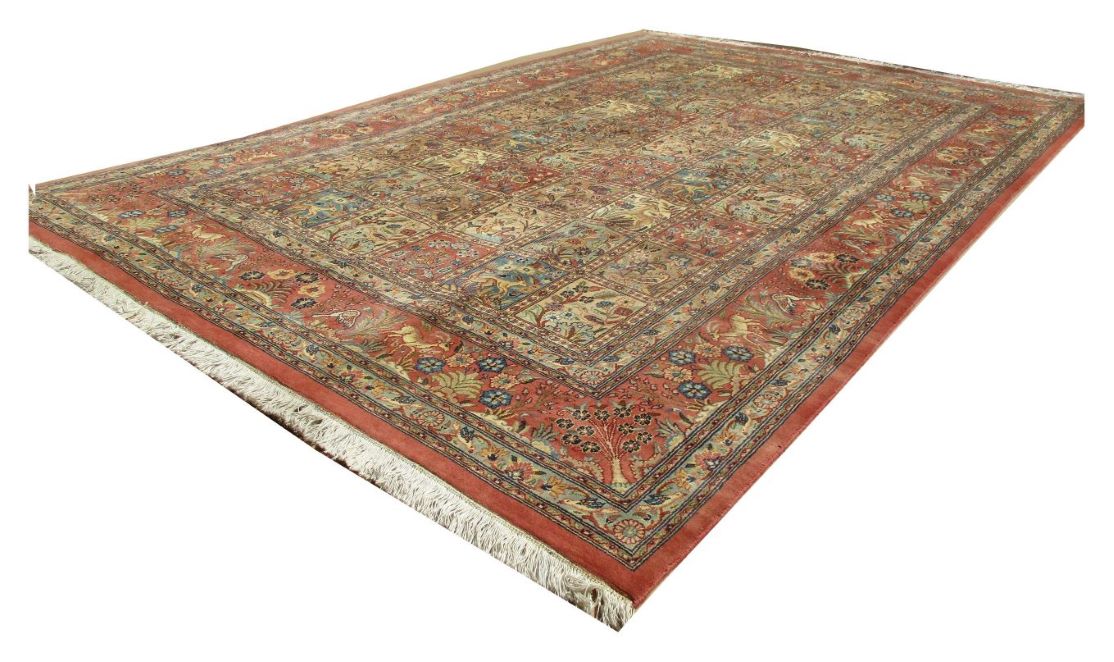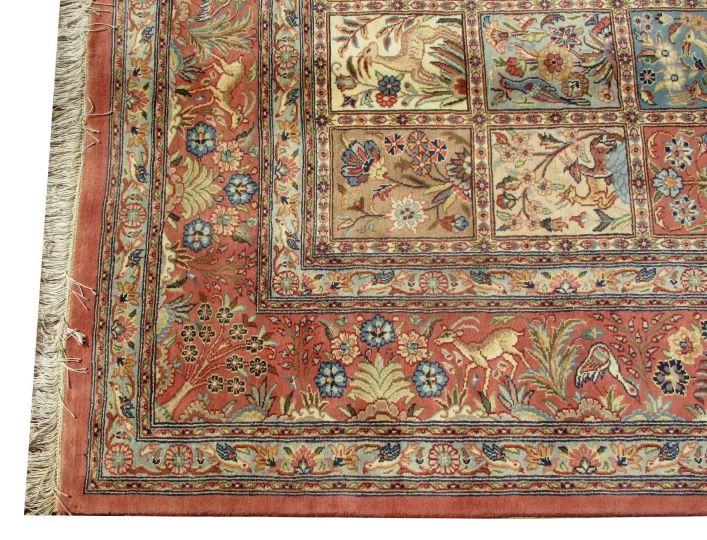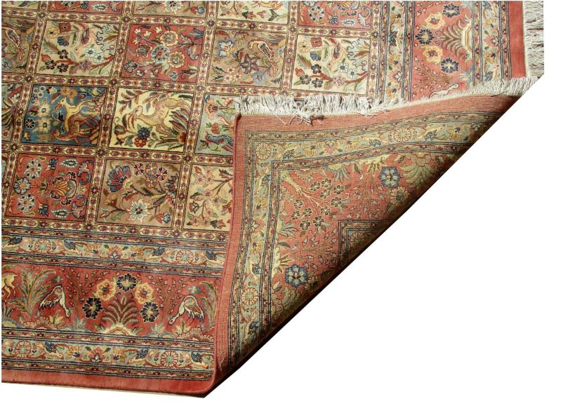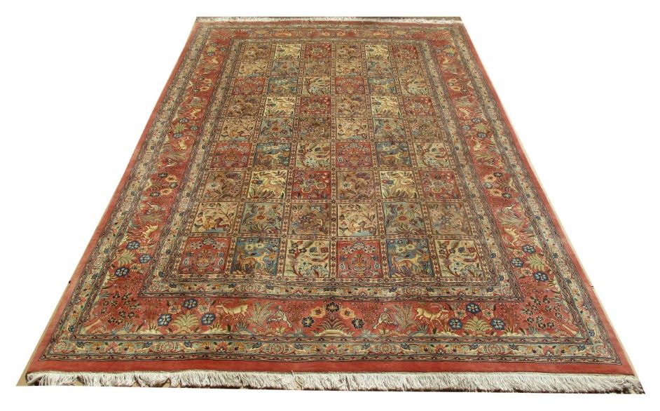 These carpets are produced in Pakistan by Master Weavers using double knot skill (Turkish Knot). Knotting is highly integrated and dense which is normally up to 500,000 knots per sq. meter. Designs are taken from famous Persian Carpet designs using high quality Marina and New Zealand wool. Design is initially created on a graphic paper and then converted into a written format which is narrated by one person next to the weavers and weavers follow the numbers of knots for each color tp place on required area. Designs and shape is often perfect and highly recommended for formal living.