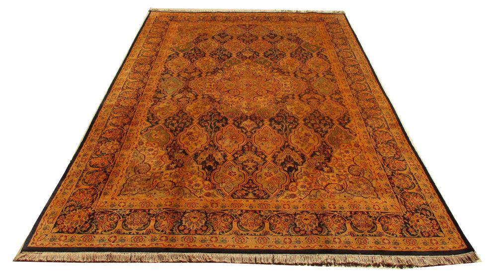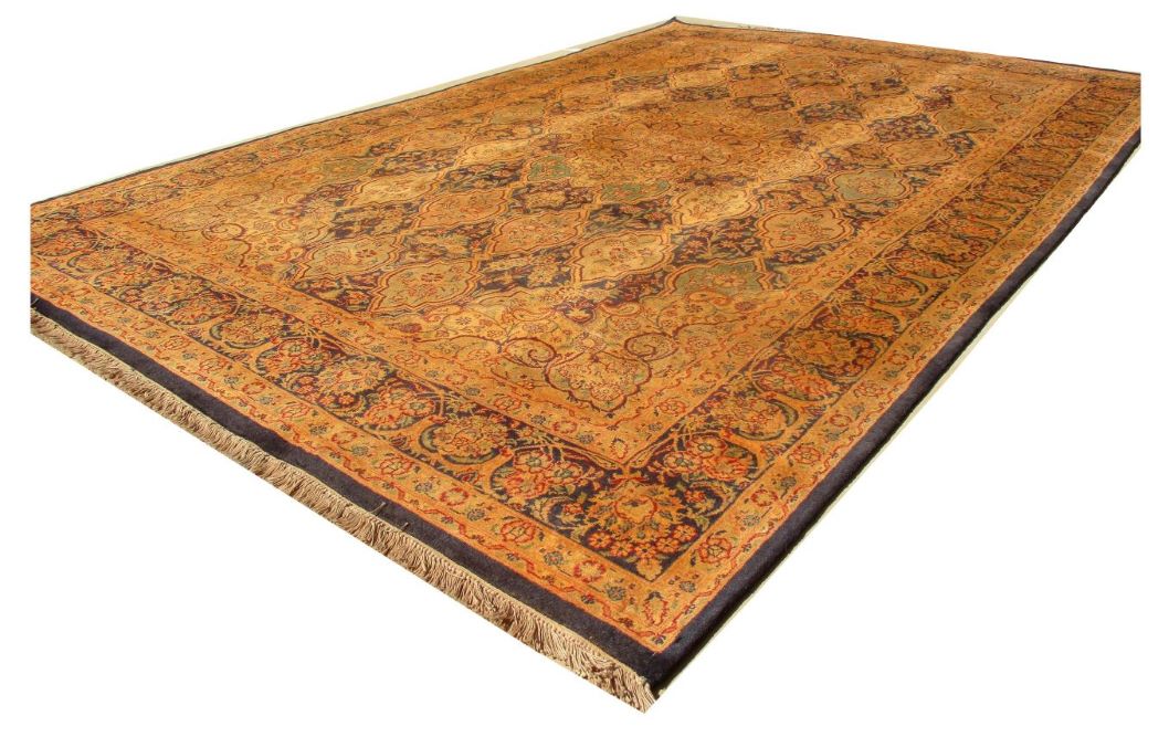 These carpets are produced in Pakistan by Master Weavers using double knot skill (Turkish Knot). Knotting is highly integrated and dense which is normally up to 500,000 knots per sq. meter. Designs are taken from famous Persian Carpet designs using high quality Marina and New Zealand wool. Design is initially created on a graphic paper and then converted into a written format which is narrated by one person next to the weavers and weavers follow the numbers of knots for each color tp place on required area. Designs and shape is often perfect and highly recommended for formal living.