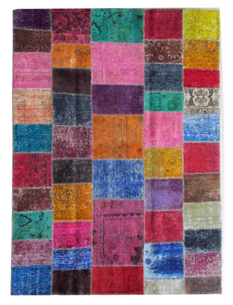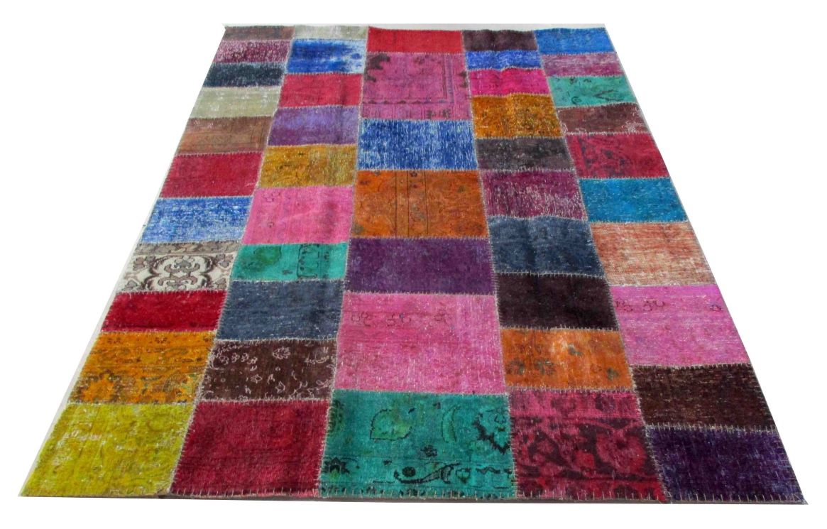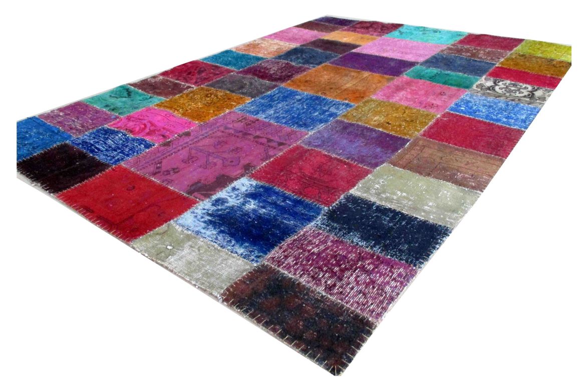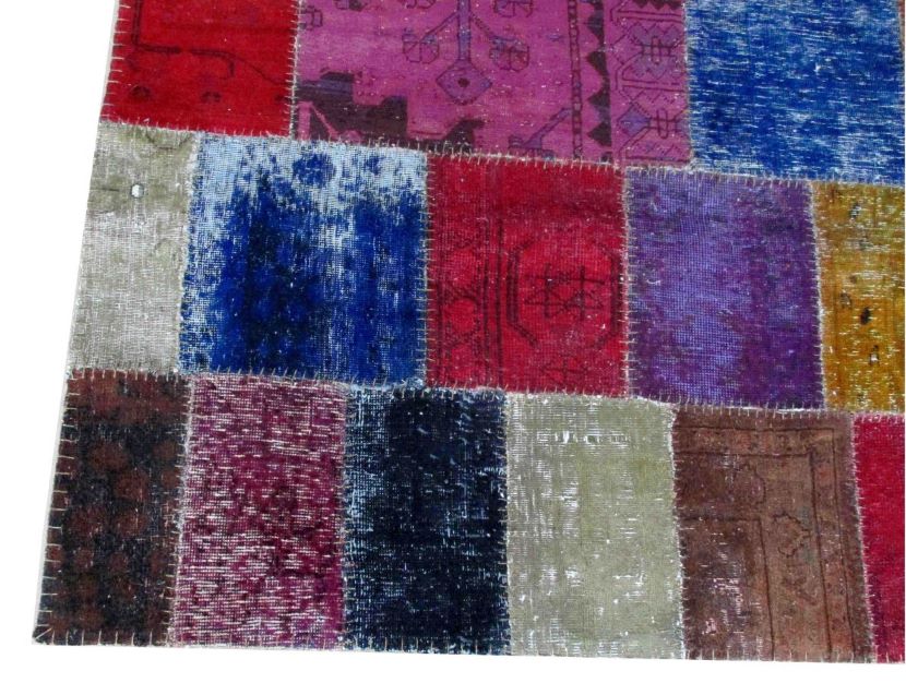 Vintage - Distressed and Color Reformed finish is achieved by undergoing a unique process on the carpets which are Semi old. Choosing the best quality carpets, neutralizing their colors, shaving/clipping down to almost Zero pile in order to achieve perfect Vintage-Distressed look, then over dyeing them with exciting vibrant colors, giving each carpet a unique and one of a kind look for modern and contemporary trend and decor. Some of the distressed pieces are also kept without overdyeing, leaving them in neutralized natural look. These carpets then cut into required size pieces to create Patch Work . All Patch work carpets are hand made and hand stitched by skilled workers.